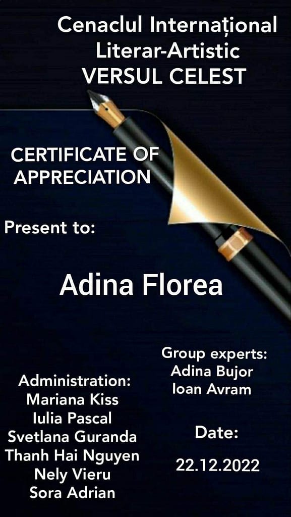 | Duma Mariana | O cunosc pe Adina prin prisma suferinței ei, pentru curajul de a lupta cu această boală necruțătoare, dar mai ales datorită, creațiilor ei de o mare mare frumusețe și sensibilitate. Am învățat de la ea cum să lupt, și eu, cu acest diagnostic dificil. Trece cu ușurință de la o tematică la alta, mângâidu-ne sufletele, dăruind totul din inimă. | 5 |