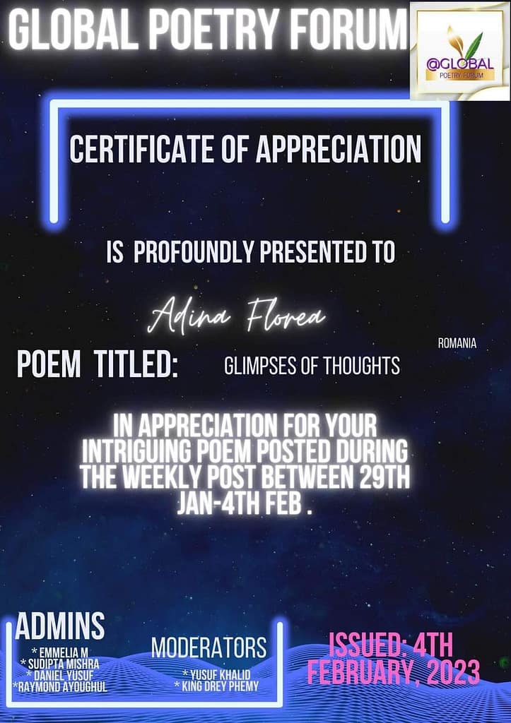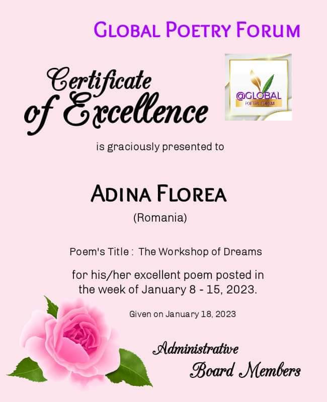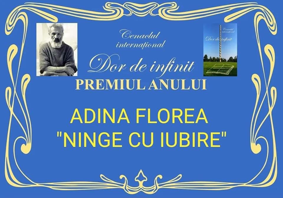 | Zamfira Rotaru | Dintotdeauna cuvântul a fost lumină și Dumnezeire, sufletul și mintea îți strălucesc la propriu, atunci când te descoperi prin ceea ce poți crea. Pentru că ,,La început era Cuvântul, și Cuvântul era cu Dumnezeu, și Cuvântul era Dumnezeu.". Iar tu Adina ești iubită de Dumnezeu, pentru că ți-a dăruit din plin acest ,,har" al cuvântului pus în vers. Omul lasă în urma lui frumosul cuvântului și al sufletului plin de iubire. Când iubești durerea ta dispare și devii o ,,lumină" pentru toți. Felicitări, din inimă! | |