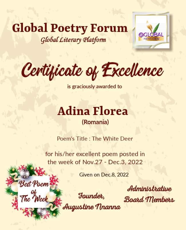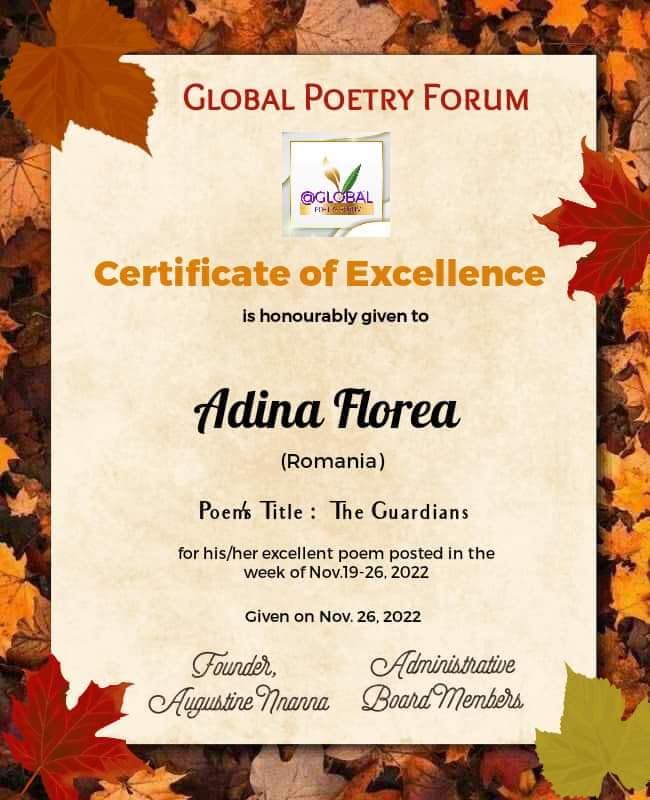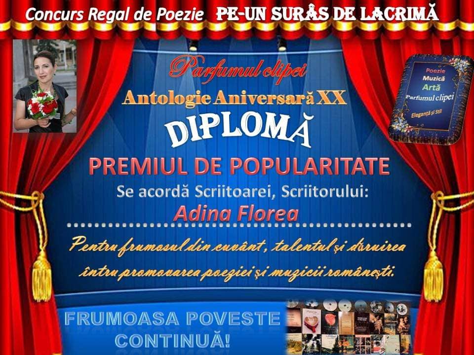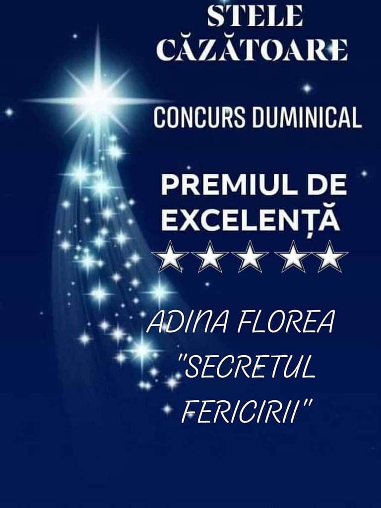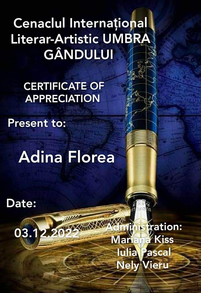 | Duma Mariana | Când îl ști pe un om de mai mult timp,te aștepți să-l cunoști, dar când acesta dăruiește din inimă, nestemate literare simți cum crește admirația și prețuirea pentru acel om. Acesta este adevărul și în cazul Adinei Florea, căci versurile ei îți rămân în suflet pentru ai aduce alinare și lumină în ziua întunecată. Felicitări și mulțumiri pentru datul tău de suflet, pentru copiii sufletului tău! | 5 |
